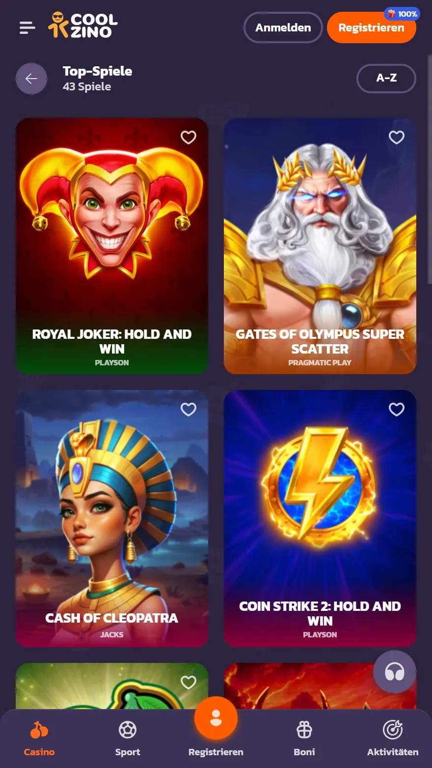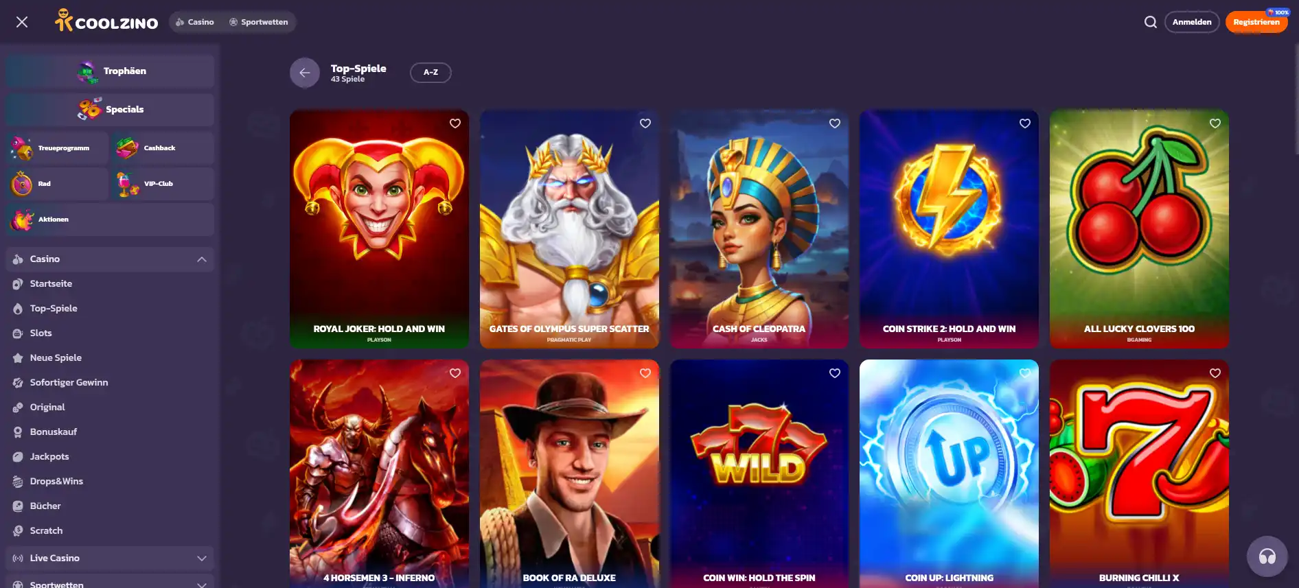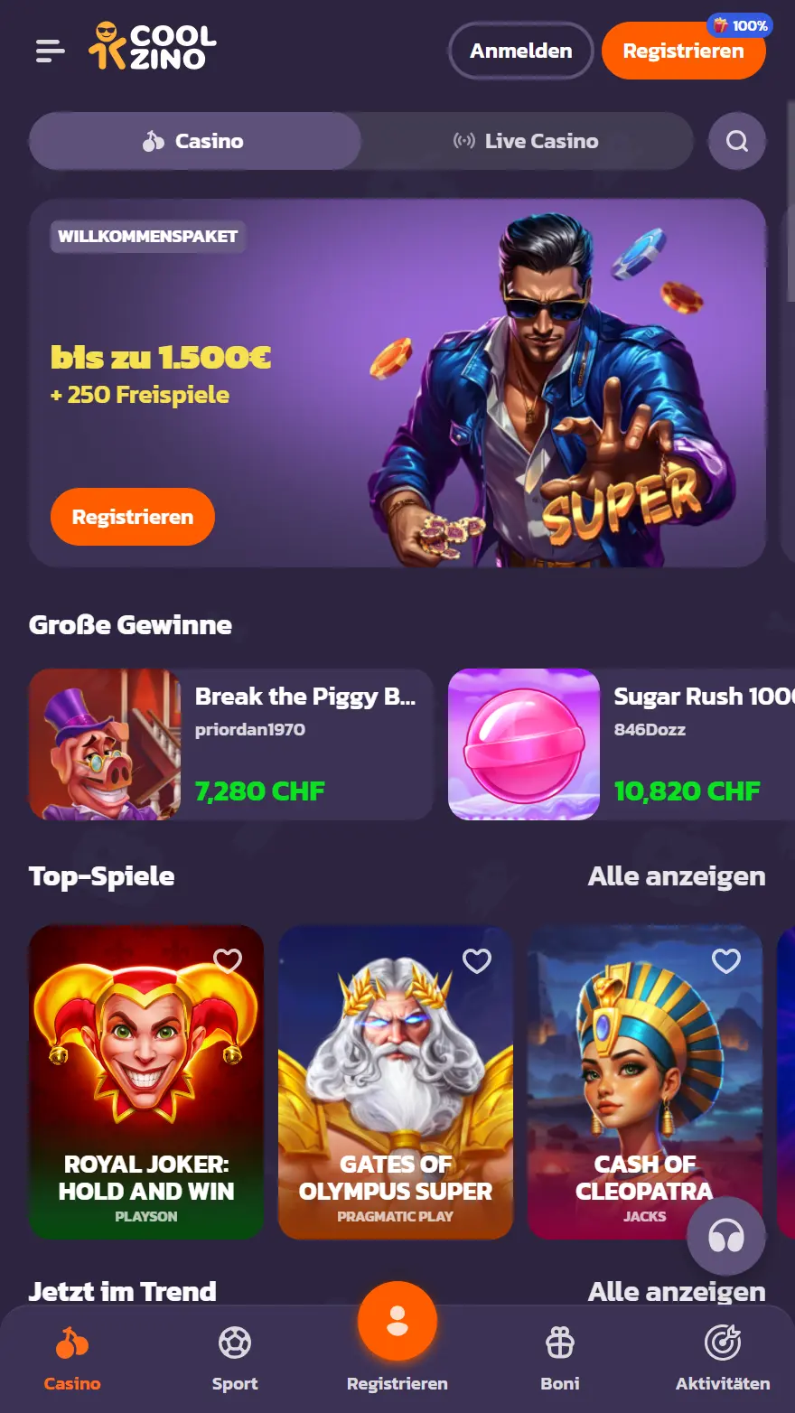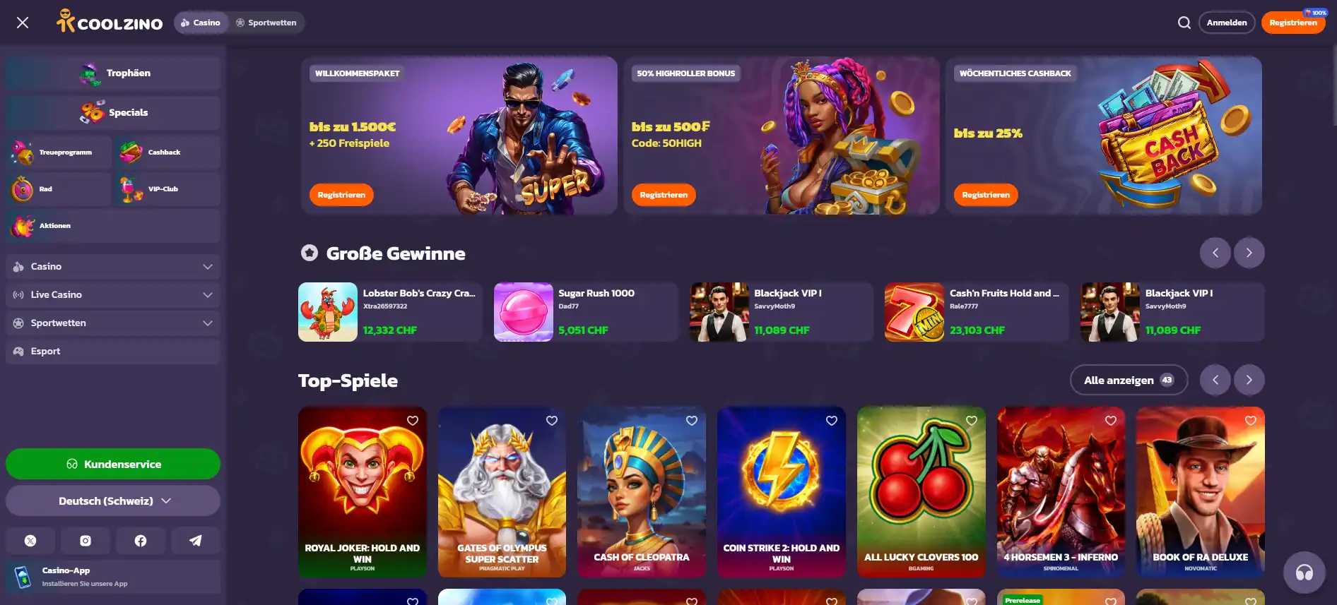 Coolzino punktet mit einer riesigen Auswahl von über 6000 Spielen, darunter beliebte Slots, Jackpots und Live-Casino-Titel von Anbietern wie Amatic, Endorphina und Microgaming. Spieler profitieren von abwechslungsreichen Aktionen, Cashback-Angeboten und einem lohnenden VIP-Programm. Die Kombination aus schneller Auszahlung, intuitiver Bedienung und rund um die Uhr verfügbarem Support macht das Coolzino Casino zu einer hervorragenden Adresse für Schweizer Spieler, die Vielfalt, Zuverlässigkeit und faire Spielbedingungen schätzen.