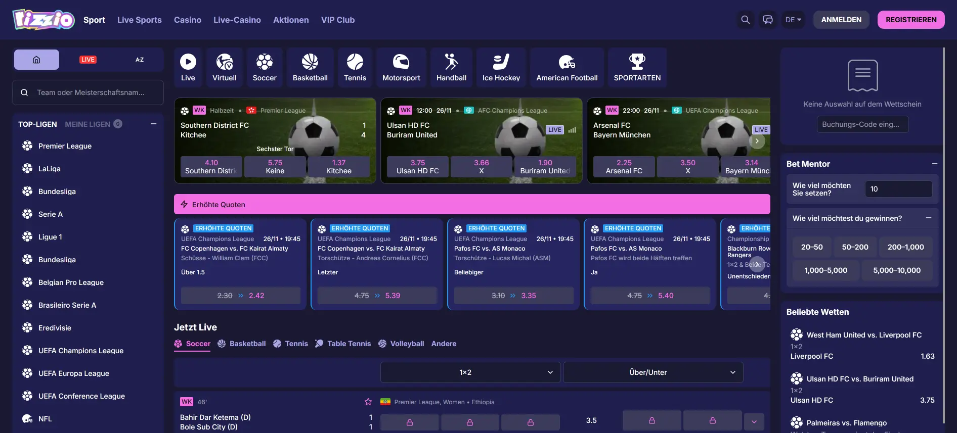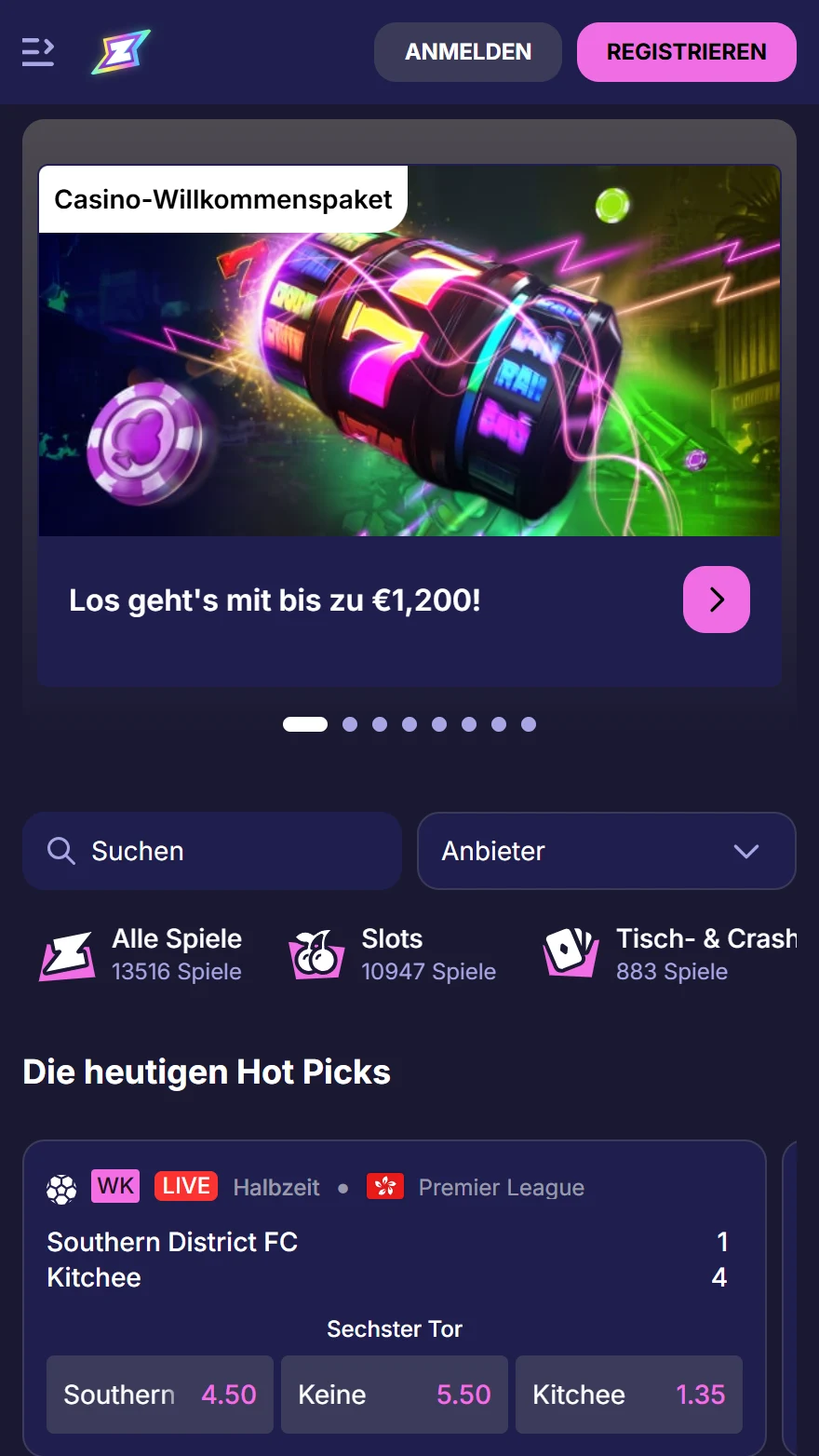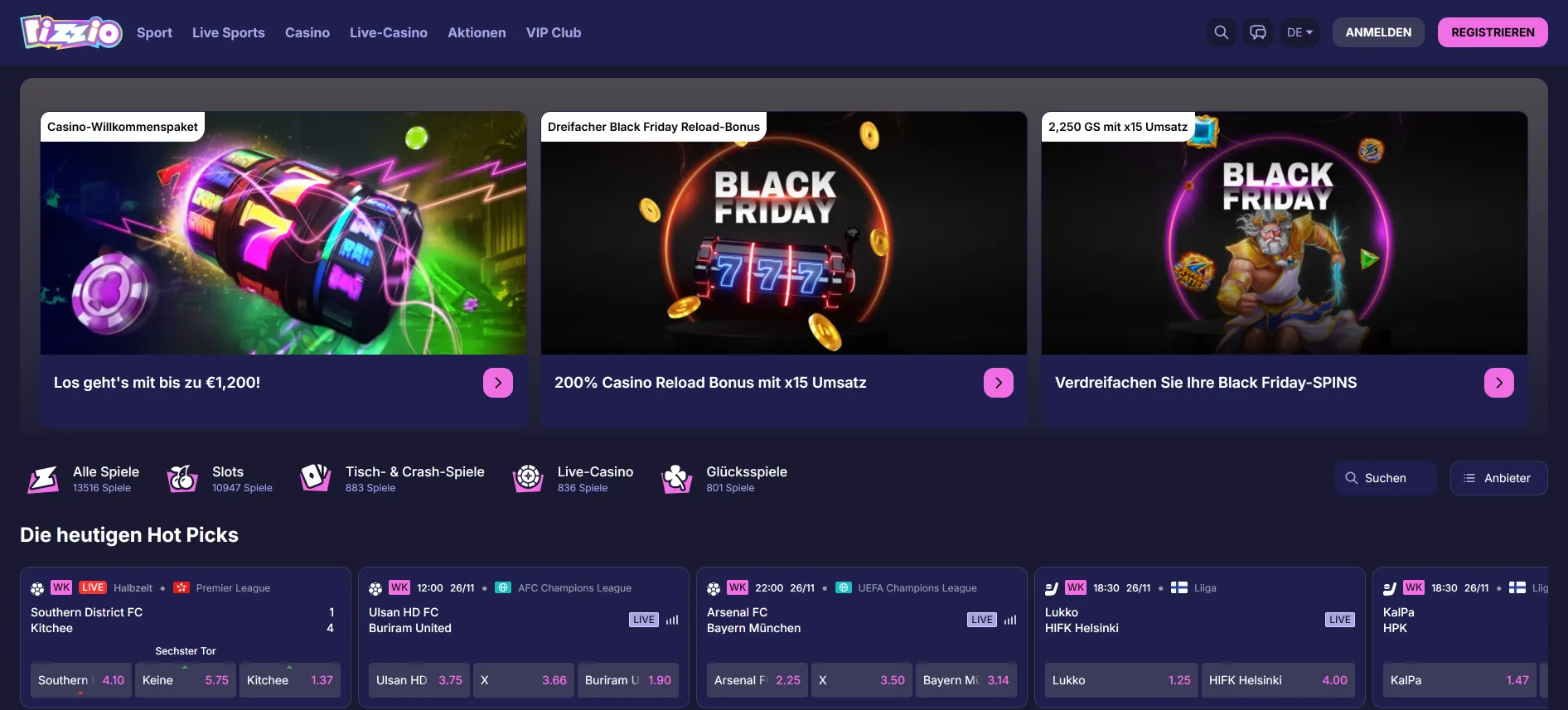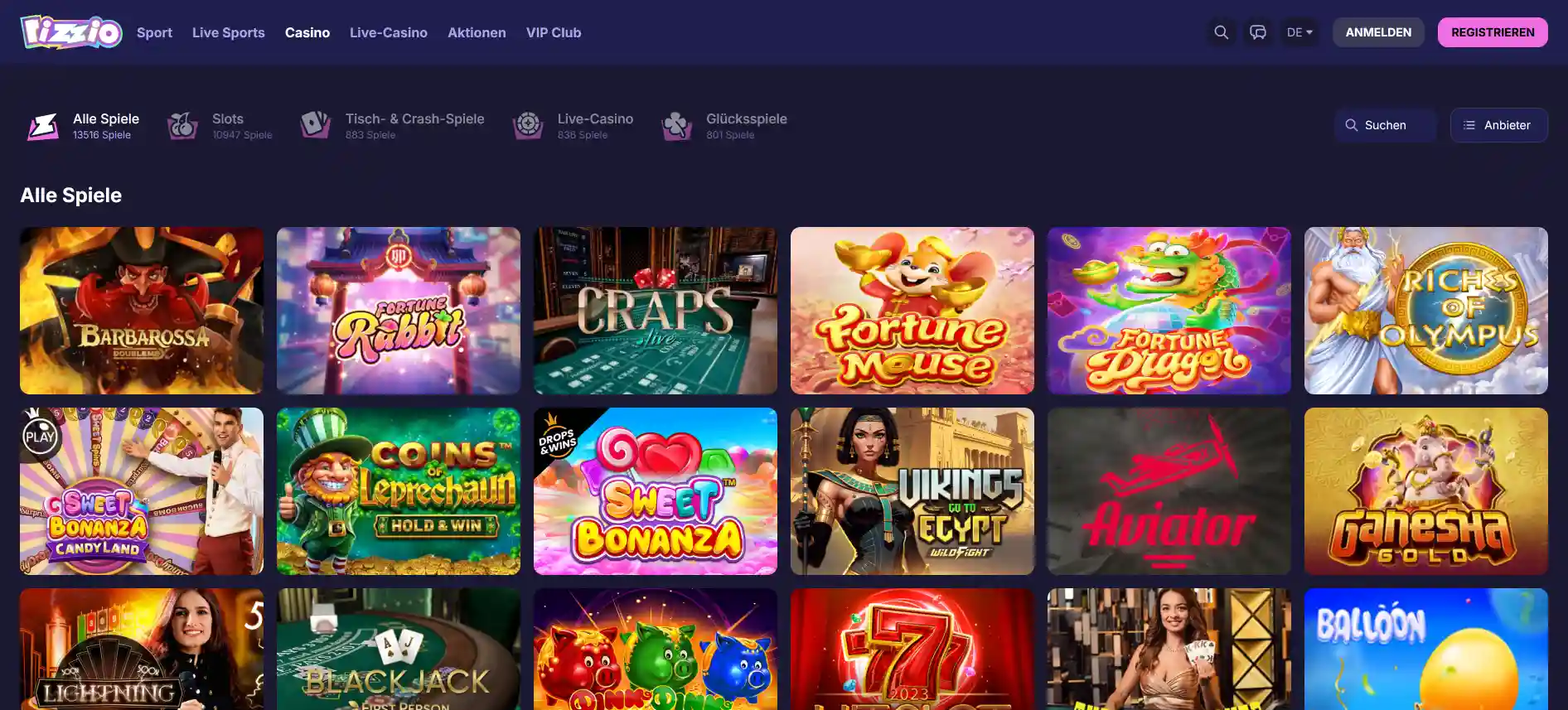 Rizzio spricht besonders Schweizer Spieler an, die Wert auf Vielfalt und ein dynamisches Angebot legen. Mit über 14.000 Spielen – darunter tausende Slots, rund 900 Tisch- und Crashgames sowie ein stark besetztes Live-Casino – bietet die Seite Unterhaltung für jeden Geschmack. Die Sportwetten-Sektion deckt Pre-Match und Live-Märkte ab und lässt sich intuitiv bedienen. Dazu kommen tägliche und wöchentliche Aktionen, die das Spielgeschehen konstant spannend halten. Die Plattform läuft stabil auf Desktop und Mobilgeräten, während klare Statistiken und Spielverläufe eine gute Übersicht geben. Vielspieler können zudem vom VIP-Service profitieren, der persönliche Betreuung und exklusive Vorteile bereithält.